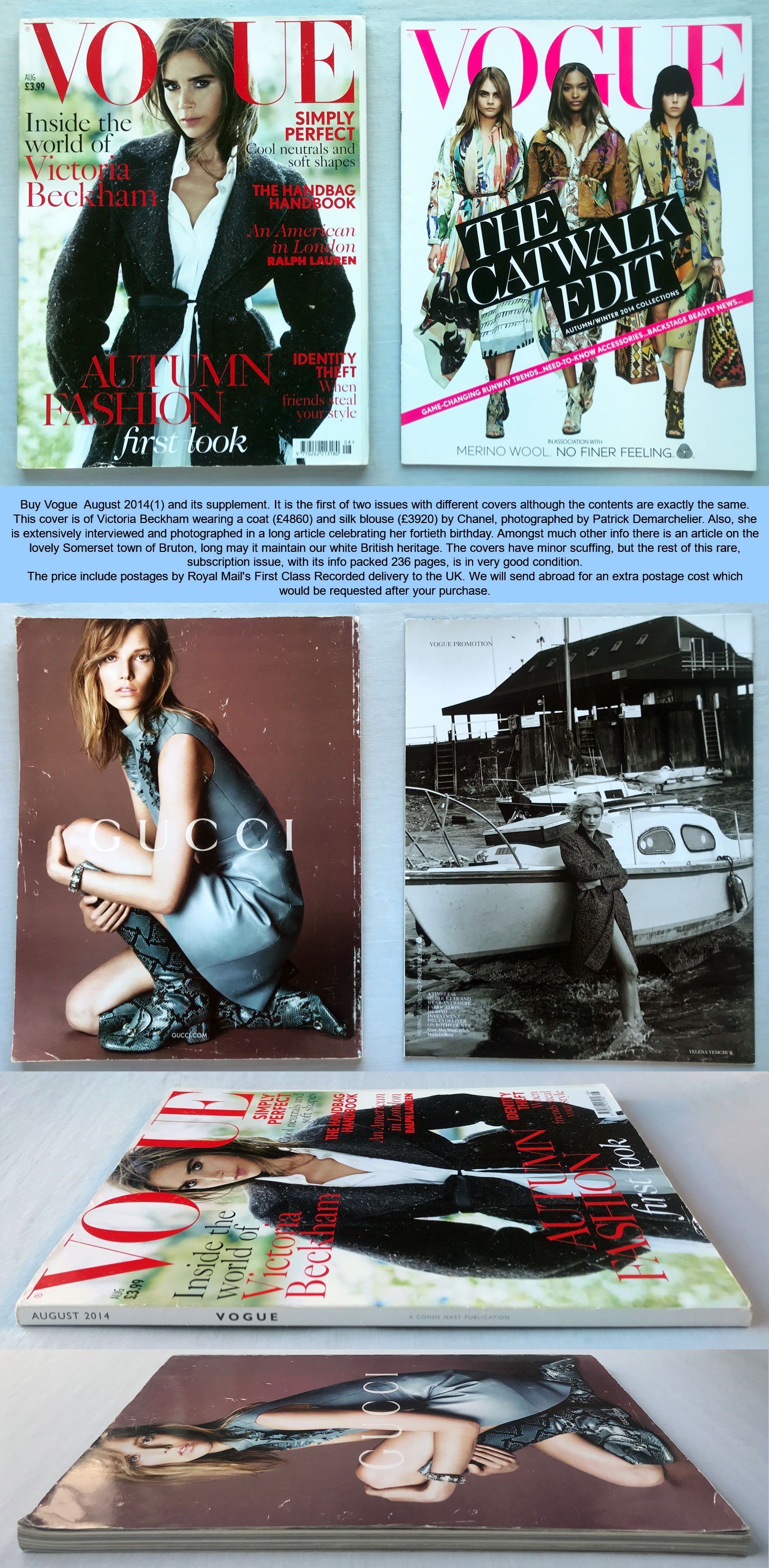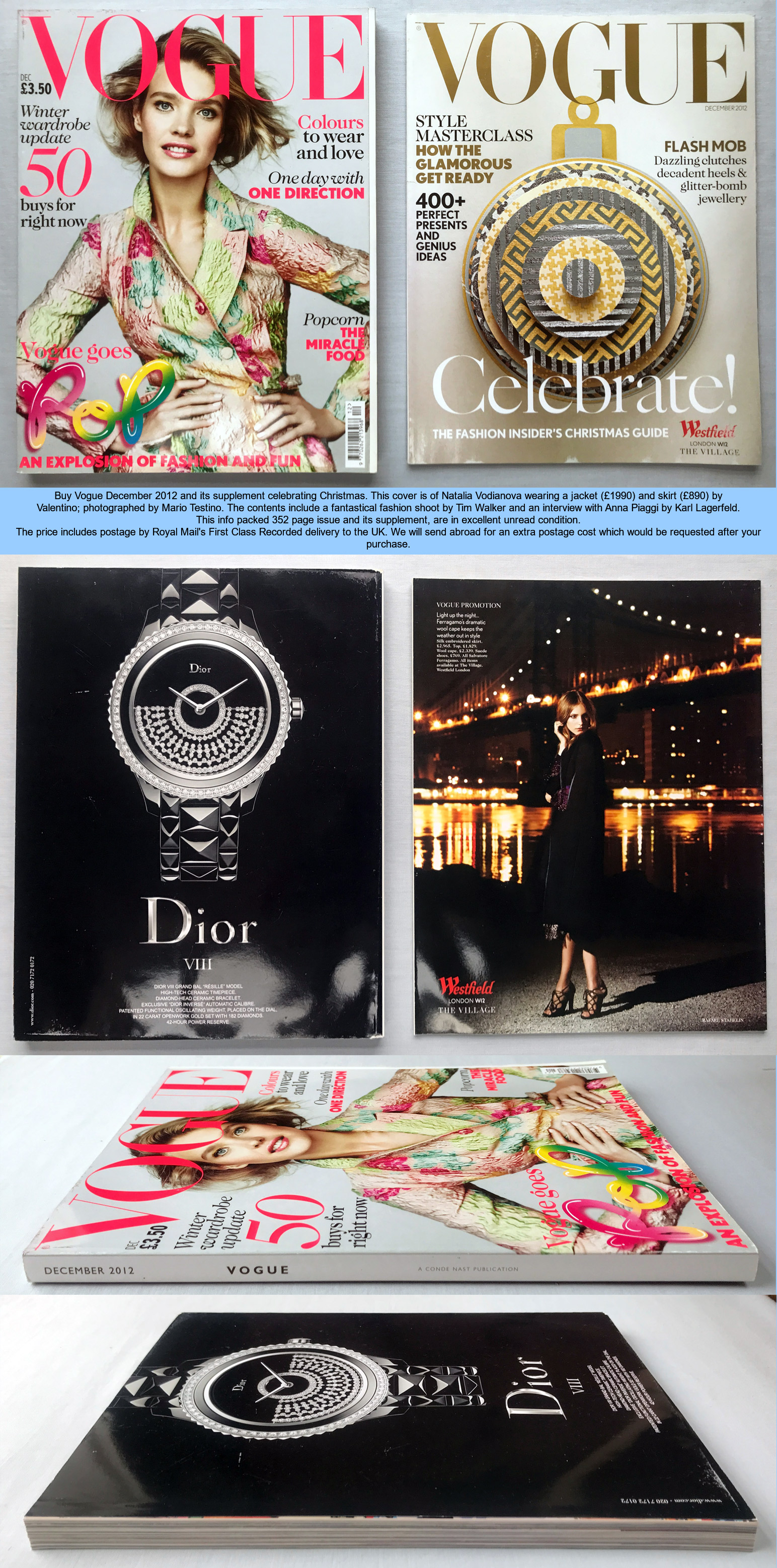 | All original UK Vogue issues from the 2010s available to buy in very good to excellent condition including their supplements. Click on the photos to see larger images and click on those to view at maximum size. Please ring or email if you do not see the one you want or one in better condition as we may have it in stock. Prices include postage by Royal Mail's First Class Recorded delivery to the UK. We will send abroad for an extra postage cost which will be requested after your purchase. |